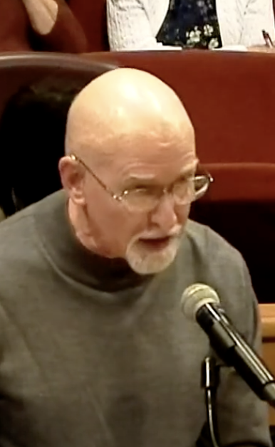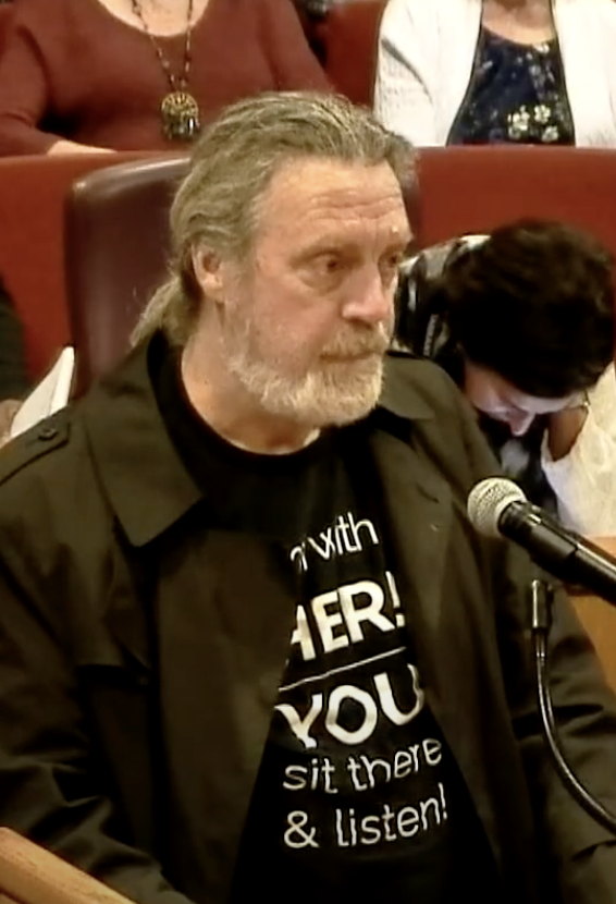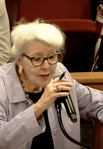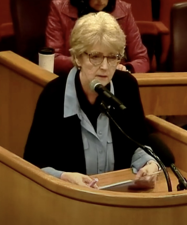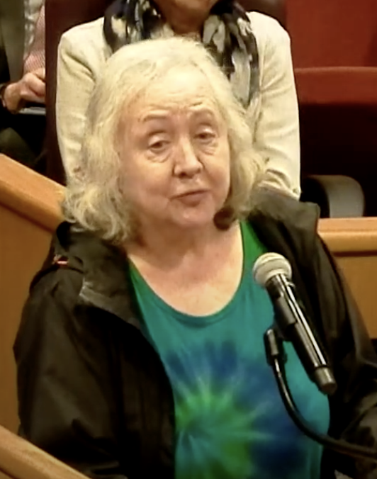 Another Action Team members, Harriet Harral, making a public comment at Tarrant County Commissioners Court in 2025 regarding the contract between JPS and the county.