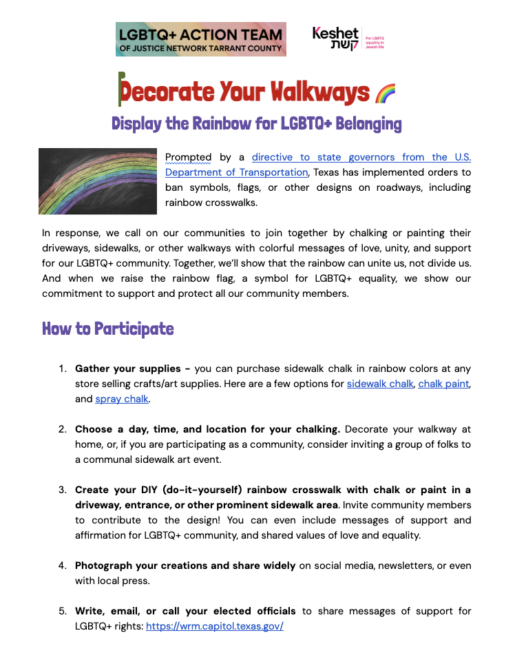 In the wake of the Texas Supreme Court decision to allow judges to opt out of performing same sex marriages without penalty, our action team leader Cantor Sheri Allen has drafted a letter to be signed by clergy throughout Texas. The letter will be sent to the Texas Supreme Court, LGBTQ advocacy organizations, and various media contacts.