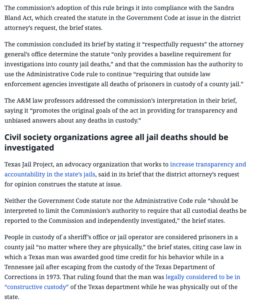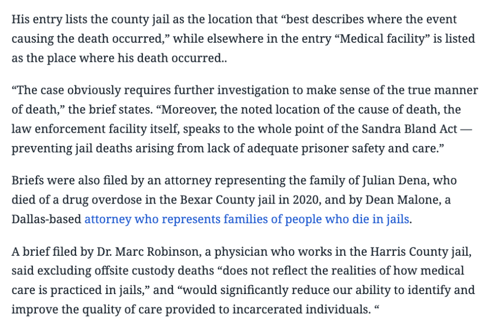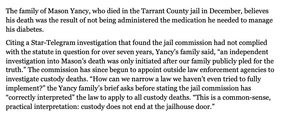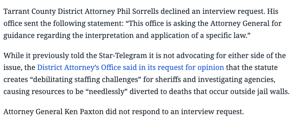 The Tarrant County District Attorney’s interpretation of a state law mandating independent investigations of deaths in county jails would “gut” the statute, according to professors at the Texas A&M University School of Law.